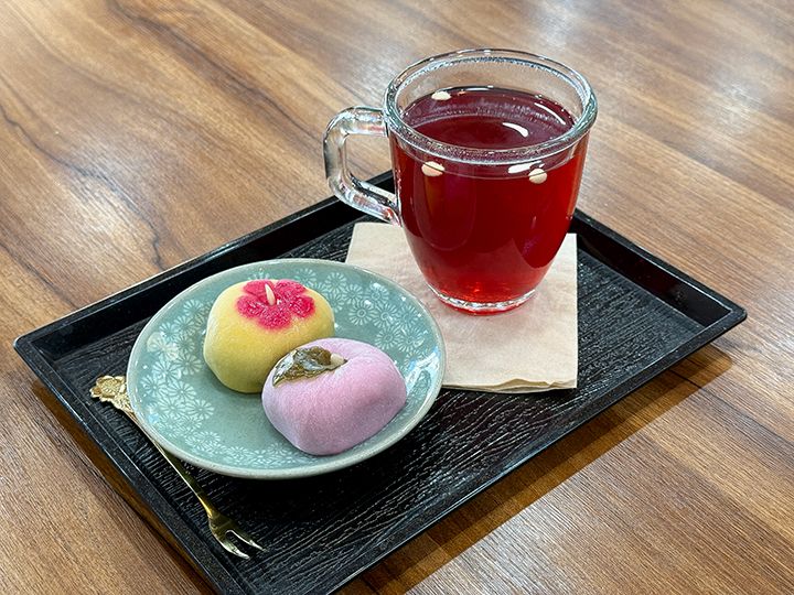 伝統茶又は薬菓セットを選択、伝統茶はチケットと地図をもらい、薬菓セットは申込時に渡される。