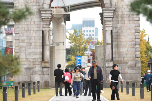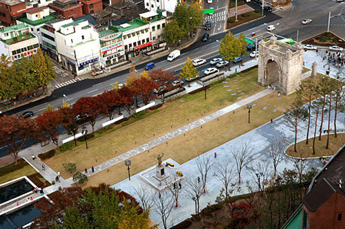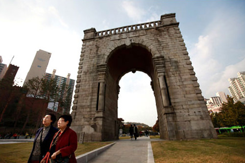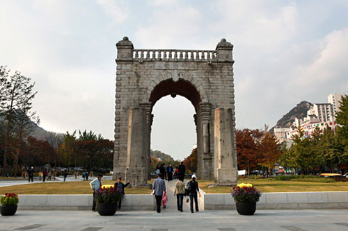 「西大門独立公園」は、日本の植民地時代に多くの独立運動家や民衆が投獄され犠牲となった「西大門刑務所(ソデムンヒョンムソ)」の跡地にあります。1987年に拘置所施設を京畿道(キョンギド)に移転する際、一部を残して広い歴史公園として整備しました。独立公園の南側入口にそびえるのが「独立門(トンニンムン)」で、1898年、清(当時の中国)からの独立を願い、フランスの凱旋門をモチーフにして建てられました。かつて「独立門」は鉄柵に囲まれ立ち入りが制限されていましたが、「西大門独立公園」のリニューアル工事の際に鉄柵は取り払われ、2009年から市民や観光客らが門の下を通れるようになりました。