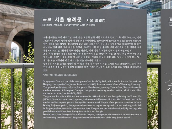 1398年に朝鮮王朝初代王である太祖(テジョ)によって建立された「崇礼門(スンネムン)」は、朝鮮の首都、漢陽(ハニャン、現在の韓国ソウル)を取り囲む城郭の正門としての役割を果たしていました。城郭には8つの大小門が作られていましたが、そのうち最も南側にあったため南大門(ナンデムン)とも呼ばれ、その名称は現在にも引き継がれています。韓国最古の城門として1962年に「国宝 第1号」に指定。2008年2月の放火事件で崩壊してしまいますが、5年3ヶ月に及ぶ復元工事を経て2013年5月4日に再び一般公開されました。現在は「崇礼門把守儀式」と呼ばれる儀式が広場で開催され、日本からの観光客にも人気です。