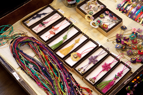 材料と針を買って帰ってもっと作りたいと言うと、最後に連結させて長さを調整するところがすごく難しいから(私のブレスレットも最後の仕上げは先生がやってくださいました)と言われ諦めましたが、2つ目以降その場で作るのなら材料代だけ払えば良いみたいでした。