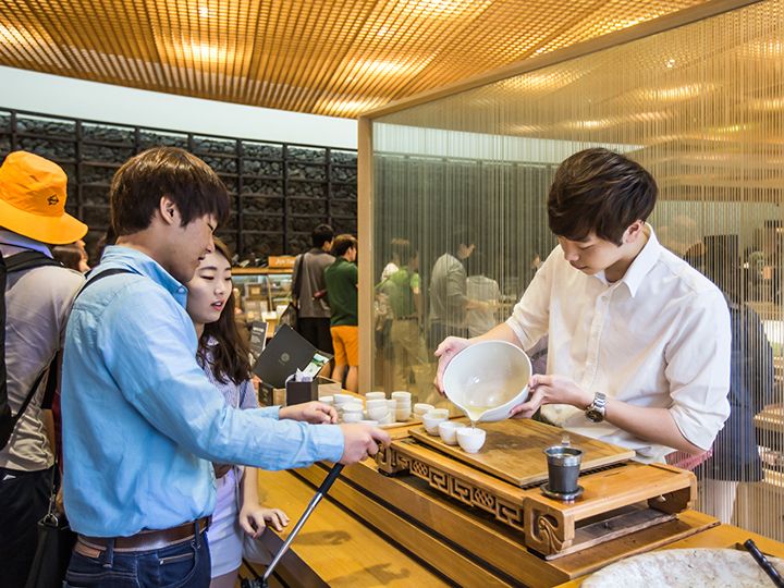 済州島南部の西帰浦にある「o’sulloc tea museum」は、韓国全土で展開しているお茶カフェ「o’sulloc TEA HOUSE」の博物館。化粧品で知られるアモーレパシフィックが運営しており、お茶の歴史を学べるだけでなく、カフェ、お土産売り場、体験スペースなどが一つになった複合スポットです。韓国のお茶文化の歴史を学べる「茶文化室」や、世界のあらゆる形の茶碗が並べられた展示が見所。 済州国際空港からタクシーで約45分、中文リゾートからもタクシーで約40分の距離。