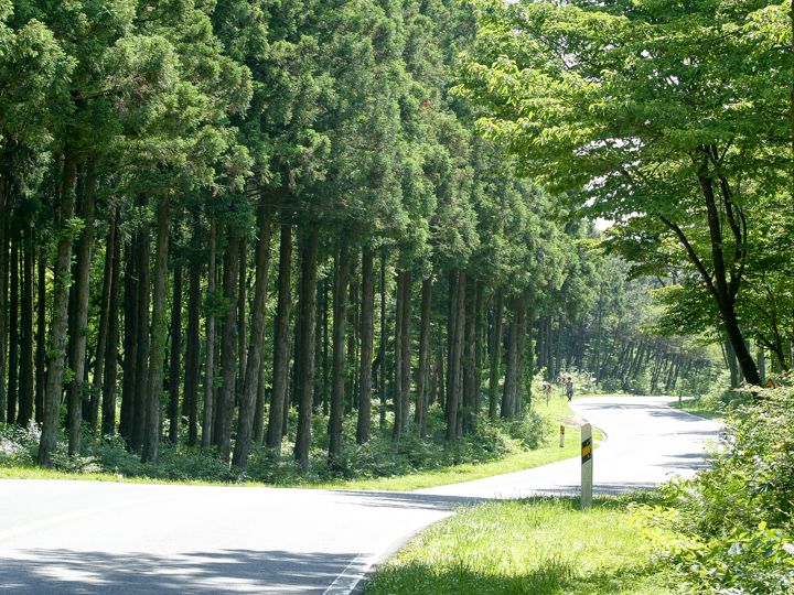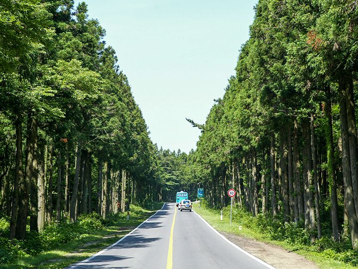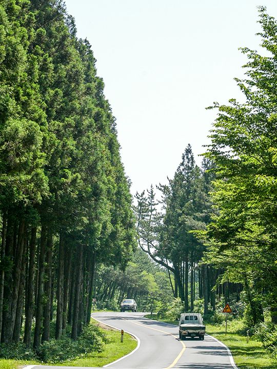 済州チョルムル自然休養森は総面積300haで、樹齢40 ~45年の杉が林の90%以上を占めています。海側から吹いて来る凉しい海風と絶妙の調和を成し、真夏でも涼しいです。元々杉は、風が強い済州島(チェジュド)で蜜柑の木などを保護するために植えられたのですが、一帯は自然休養森としても開発されました。中には散歩道、湧き出る泉、池、芝広場、民俗や運動、遊戯の施設、キャンプ場が揃っており、散歩道のプロムナードは、比較的緩やかでお年寄りや障害者も歩きやすいでしょう。海抜697mまで上がる登山道は、1時間ほどで往復できます。
