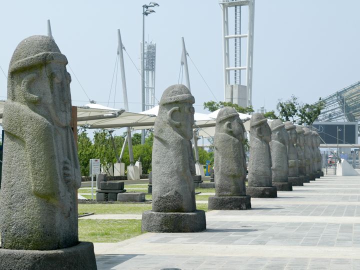 2002年の日韓ワールドカップサッカー大会で試合が行われた、韓国10都市の一つ・西帰浦(ソグィポ)市に位置するのが「済州ワールドカップスタジアム」です。定員約42,000人の一部屋根付きサッカー専用スタジアムで、完成度の高い設計と開放感のある景観が特徴。スタンドからは、済州島ならではの海や島の風景、さらには「漢拏山(ハルラサン)」も見えます。