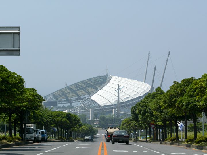 Kリーグのチームのホームスタジアムですね、試合のない日に外側をお散歩しました。試合のある日は活気にあふれているのでしょうね。海風対策だと思うんですが、入り口が高いところにあって、芝生のグラウンドが低くなってるのと、素敵な屋根が印象的でした。