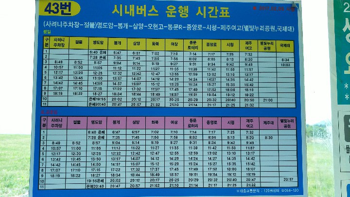 ちなみに、済州市外バスターミナルから710、720、730番のいずれかのバスに乗り、クンドンネ(큰동네)という停留所で1番のバスに乗り換え、4.3平和公園(4.3평화공원)で降りれば、バスで行けます。帰りは、4.3平和公園から1番のバスに乗り、ポンゲドン(봉개동)で710、720、730番のバスに乗り換えると、済州市外バスターミナルに戻れます。