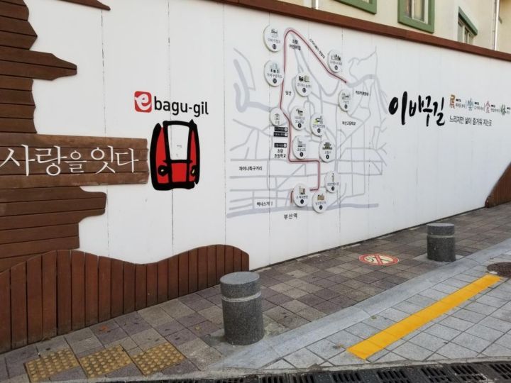 草梁イバグキルは、釜山駅から山側へ進むと警察があります。警察を正面に見て左側へ坂道を100mくらい進むと「草梁イバグキル」の看板があります。そこを曲げれば、散策できます。
