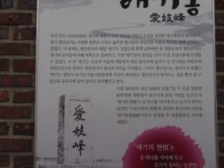 朝鮮時代、戦乱を避けるため愛する男と南へ避難した妓生・愛妓は、途中で男と離れ離れになってしまいます。逃げ延びて男を待ち続けたものの、結局この地で果ててしまいます。村の人々は愛妓の遺言どおりに、遺体を男のいる北が見えるこの山頂に埋葬したという話が伝わっています。