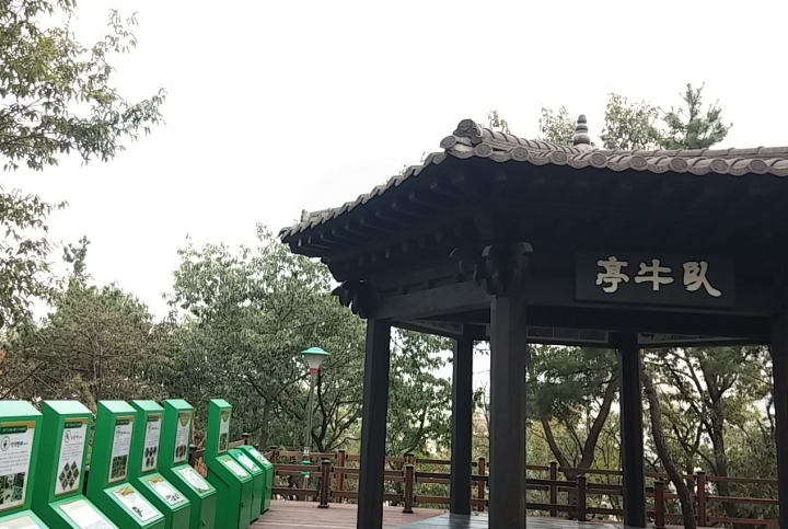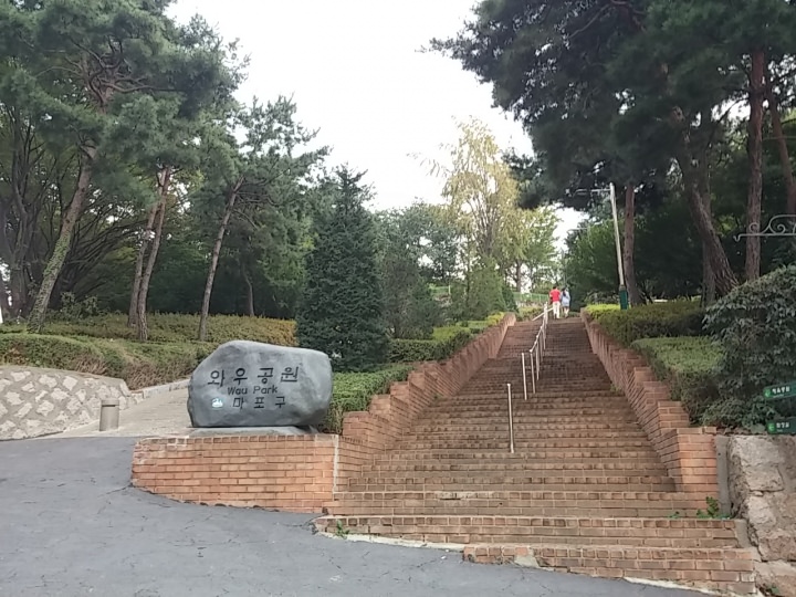 この山の一帯が「ワウ公園」または「ワウ山公園」と呼ばれる公園になっています。バトミントン場やバスケットボール場、散策路、韓国でお馴染みの「謎の運動器具」などが備えられた、健康に良さそうな公園です。カップルの多そうな土地柄ですが、動植物に関する解説パネルなども立っていて、子連れ散歩客も多く見られます。