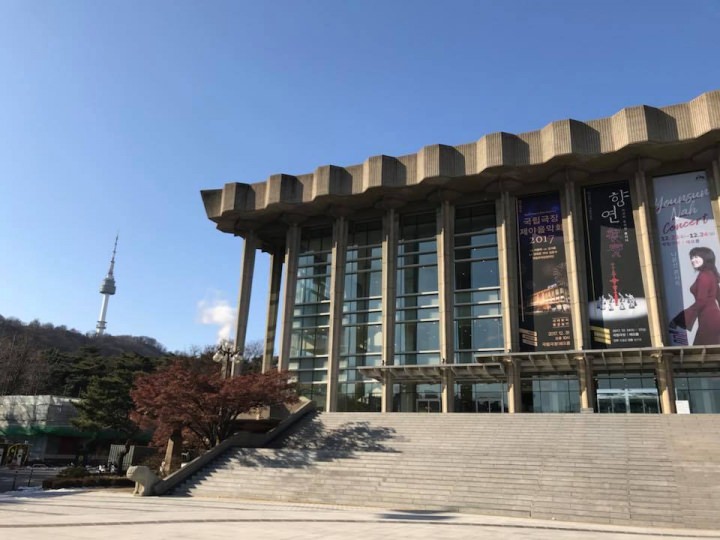 少々年季が入っていますが、伝統を感じさせる立派なホールです。外観もどっしりとした感じの堂々たる建物です。夜、コンサートが終わって劇場を出ると、ライトアップされたNソウルタワーが間近に見えて、コンサートの余韻の中、なんとも素敵な雰囲気を味わうことができます。