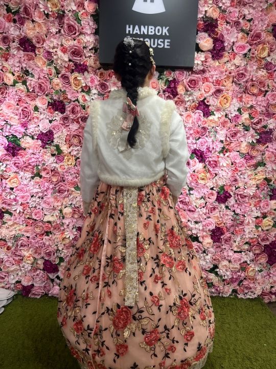 韓服選びもスムーズに出来て着付けもセットもスムーズで、最後は結婚式用?の羽織のようなのも着せていただき写真を撮ってくれました。