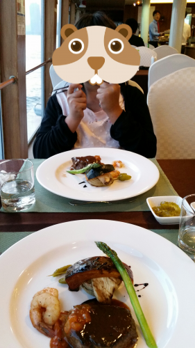 この日のメニューは、カムジャスープ(ポタージュ系)スモークサーモンサラダ、パン、ステーキ、デザート(一口サイズのケーキ2種類、果物)、コーヒー(砂糖有り。ミルクは、用意がないです)