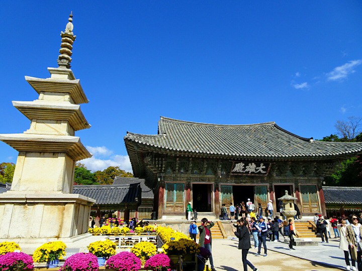 10/19(金)に行って来ました。新慶州駅からバスに乗り継ぎ、10時半頃到着しました。秋の快晴の日という事で、観光客がとても多かったです。遠足なのか小学生くらいの子供達も沢山いました。世界遺産を心静かに見学…という感じにはなりませんでしたが、一人旅で仏国寺はおろか慶州も初めてで色々不安だった私にとっては観光客が多い方が安心感がありました(笑) 気候もちょうどよく、紅葉も始まり掛けていて、秋に来て正解だと感じました。