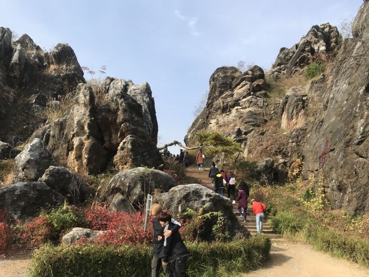 金月峰という小高い丘の上に駐車場がありまして、クルマをとめると目の前に奇岩が見えます。これがいわゆる金月峰だそうで、ここで記念撮影をする方々がたくさんいらっしゃいました。真ん中の道をさらに進みますと、湖畔沿いの展望台に到着し、ここから眺める湖の景色もなかなかのものでした。