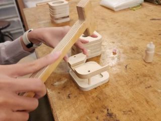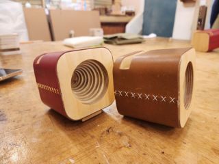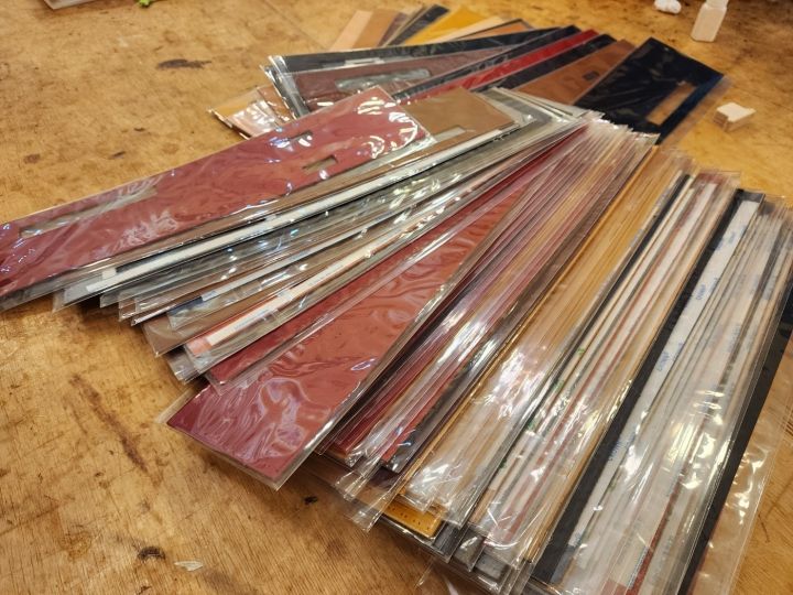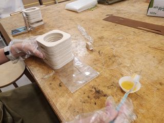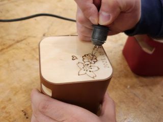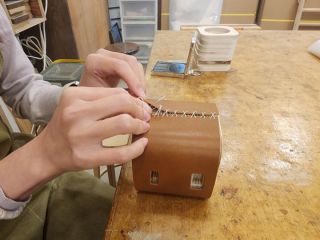 ヤスリかけて、エアーで木のカスを吹っ飛ばして、木のパンチでトントン組み立てて、ヤスリかけて、油塗って磨いて、皮のカバーを縫い上げて