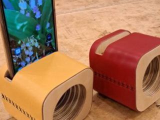 携帯電話を差し込むだけで、木を通して音が広がります。