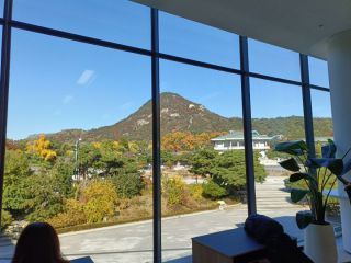 そして2階に上がると窓の外に「青瓦台(チョンワデ)」の一部が見え、ブースの中に入ると近代韓国の歴史、現大統領の紹介があり、大統領府の大統領執務室のように作られた撮影ブースでは、自分自身が大統領になったかのように、自由に写真を撮ることができます。