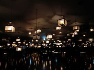 真っ暗闇の中に、宮殿の軒先に吊り下がっているような四角いガラスランプがゆったりと上下に揺れており、とても幻想的でした。
