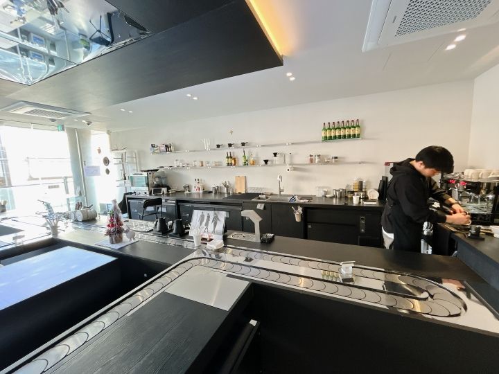2階には併設のカフェがありますがこちらも回転寿司のレーンコンセプト(?)のメタリックなオシャレ空間でした。