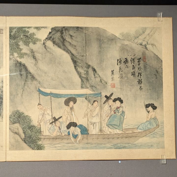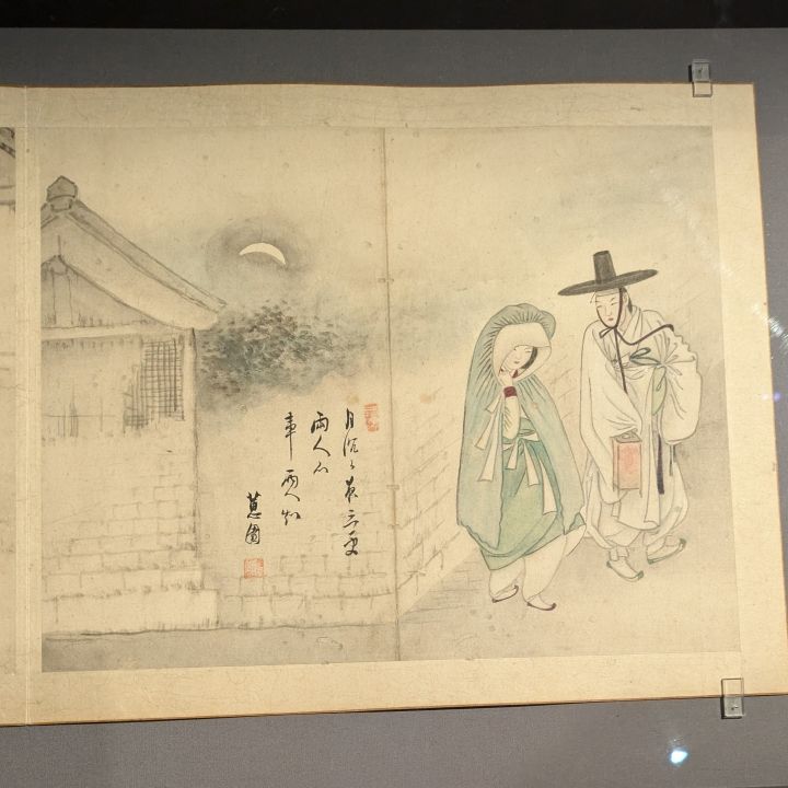 そして最初の展示室。ついにシンユンボク作品をこの目で見る時がきました。この展示室にはほかの画家の作品もあるのですが、シンユンボク作品の前には一際長い列が。この待つという時間が楽しみな気持ちをまた盛り上げてくれて、ガラスケースの中に展示された風俗画、なんと8点もありました!!もう、もう、こんなに間近で、こんなにたくさんの点数を見られるなんて思いもしなかったので本当に感動して、渡韓と展示のタイミングが合ったことに感謝。美術館にたどり着くまでに行き方を教えてくれたアジョシやアジュンマに感謝。こちらの掲示板でこうしてやりとりができたことに感謝。4時間もかかったけれど来てよかったーっ!と心から思いました。