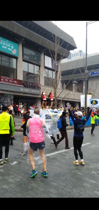 スタート地点の光化門はランナーで一杯です、荷物を預け軽くアップ、スタートギリギリまで我慢しようとしたが、我慢出来ずカッパを脱ぎ捨て、いざスタートラインへ準備体操、韓国マラソンの準備体操は流行った曲が流れます、もちろんオッパ、カンナムスタイルです、舞台の前に立ち美女ダンサーがまるでバックダンサーです、そしてテンション上がりスタートです、ポケットにスピーカー入れ常に曲を流し、スタートして間もなく明洞、朝8時過ぎなのに応援が沢山ありました、嬉しくなり立ち止まりダンスを披露、マラソンのペース配分は得意だが、ダンスのペース配分はド素人で最初の10kmで踊り過ぎ、ノリの良い応援にだけにダンスをする事にしました、