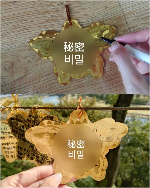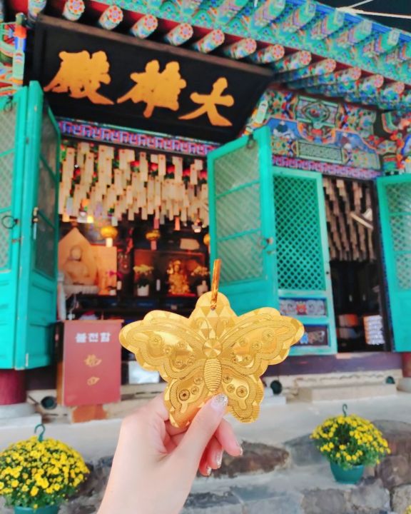 嶺南楼のすぐ側(奥)に舞鳳寺という寺院があり、蝶の形の絵馬のようなものを₩5,000で購入し、願い事を書いて吊るして来ました。キラキラの黄金なのでご利益がありそうです。