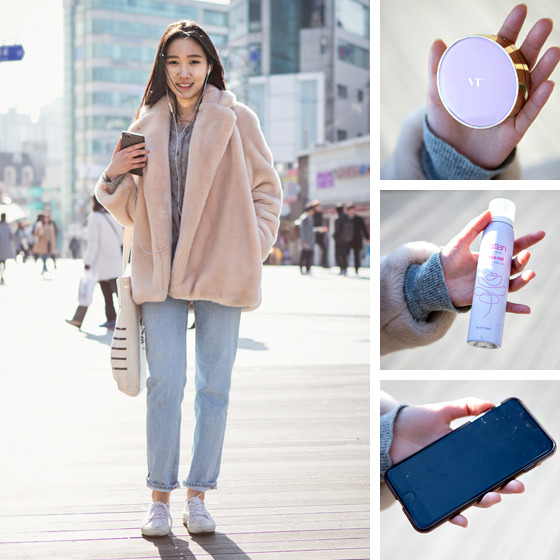 写真中央:mistianのエッセンスミスト(18,000ウォン)は「OLIVE YOUNG」で買いました。黄砂やPM2.5は肌荒れの原因になるので対策は欠かせません。小まめにケアできるよう、年中持ち歩いてるんです!