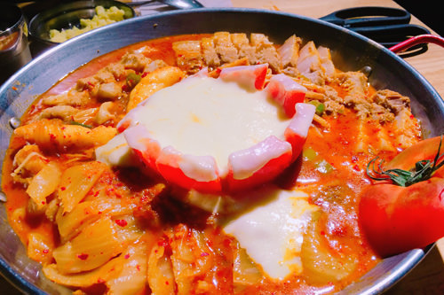 その中でもこの日は、人気メニューの「圧力鍋キムチチム」(1人分11,000ウォン)に「トマトチーズ」(3,000ウォン)を追加して注文しました。