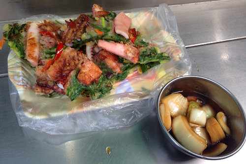 チヂミを焼く香ばしい匂いに誘われて、今回はこれを食べることに。買い物に集中したせいか、大分お腹がすいていたので、がっつり食べれそうなイカとニラのチヂミをたのみました。玉ねぎの入った醤油ベースのタレがついていましたが、ニラとイカの風味でそのまま食べても十分おいしかったので、無意識に3分の2はタレをつけずに食べていました。焼きたてということもあり、本当においしかった!思わず昼間から