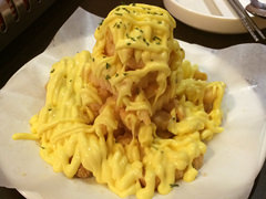 こちらのトッポッキは、お餅におでん(練り物)、春雨、ゆで卵、チョルミョン(麺)、長ネギ、キャベツなどが鍋に入って出てくる即席トッポッキスタイル。甘辛のトッポッキと相性抜群なのがサイドメニューのフライドポテトで、味はガーリックバターとプルコギ、チーズの3種類があります。一番人気なのがバターガーリックフライドポテトで、濃厚なクリームタイプのソースがフライドポテトの上にこれでもか!というくらいたっぷりかかっていてビジュアルもGOOD。ポテトを食べていたら付け合せのケチャップがなくなってしまったなんてことがよくありますが、ここではソースが余るほど(笑)。ポテト好きは是非お試しあれ~。