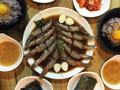 とりあえず、「海老の醤油漬け+たまごご飯」を注文。写真どおりの凛々しい姿に思わず興奮。カンジャンセウのたれを卵ご飯に混ぜてえびと一緒に一口。思わず言葉を失うほどの感動が…えびも味がよく染みていてぷりっぷりとした食感。殻には切り込みがあって食べやすく、横に添えてある青唐辛子がクセになるピリッと感。一緒に出てきたおかずも文句なしのおいしさ!のりまでついてきてご飯が進む進む。結局ご飯を3杯たいらげて大満足でした。
