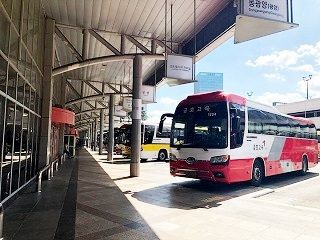 1.発車時刻が近くなるとバスが入ってきます。バスのフロント部分に目的地と発車時刻が表示されているので、チケットとよく確かめてから乗車しましょう。