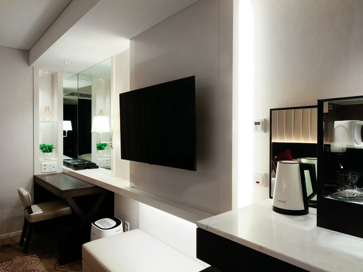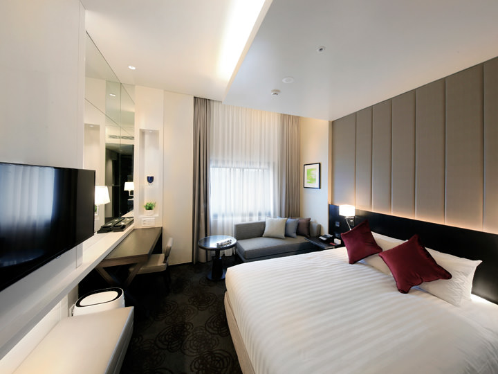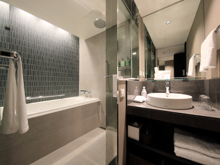 客室はオフホワイトとブラウンカラーを基調としたシンプルながらも洗練された優雅な雰囲気が漂います。バスタブ、洗浄機付トイレ、無料Wi-Fiがあるだけでなく、日本の電子機器も変圧器なしで使える110Vの電圧も全室に完備されており使い勝手も抜群です。