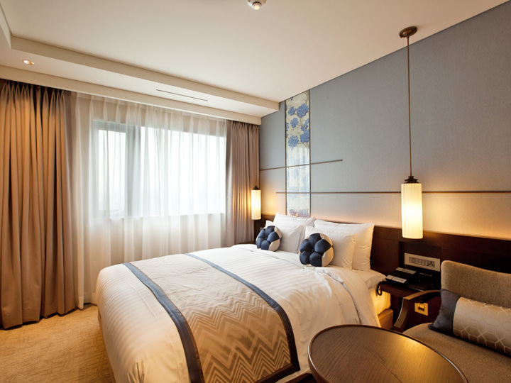 客室はベージュ系のカラーで統一され、テキスタイルには韓国的なイメージを取り入れるなど、明るく華やいだ雰囲気が漂いながらも落ち着ける空間です。各客室はスーツケースを広げて荷物整理をするのにも十分な広さがあり、ゆったりとしています。全室浴槽付のため、旅の疲れを癒すのにもピッタリ。フロントスタッフは全員日本語が可能なため、韓国語が全くできない人でも安心して宿泊することができます。