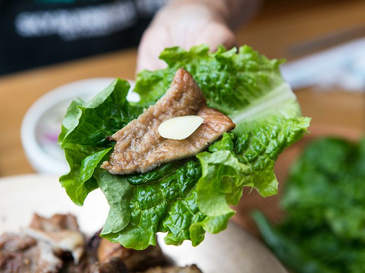 大きな肉をのせ、ある程度焼けてきたら、はさみを入れて更に焼きます。「テジカルビ」は焦げやすいので、卓上で焼く際は、頻繁に裏返すなどお肉の管理が必要で、焦げ目ははさみで切り落としたりしましょう。 焼きあがったお肉はおかずと一緒に食べるのがおすすめ。お肉をソースにつけ、サンチュに包んで頂きましょう!にんにくは、生のものをお肉にはさんで食べるのが韓国式ですが、鉄板の上で焼いてから食べても大丈夫です。 | ||||