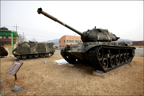 また朝鮮戦争時代に国連軍の攻撃で破壊された北朝鮮の軍用貨物車が戦争の激しさを物語るように置かれ、駅前には迷彩色の戦車も展示されています。駅のすぐ横にはタンチョウの資料館もあります。