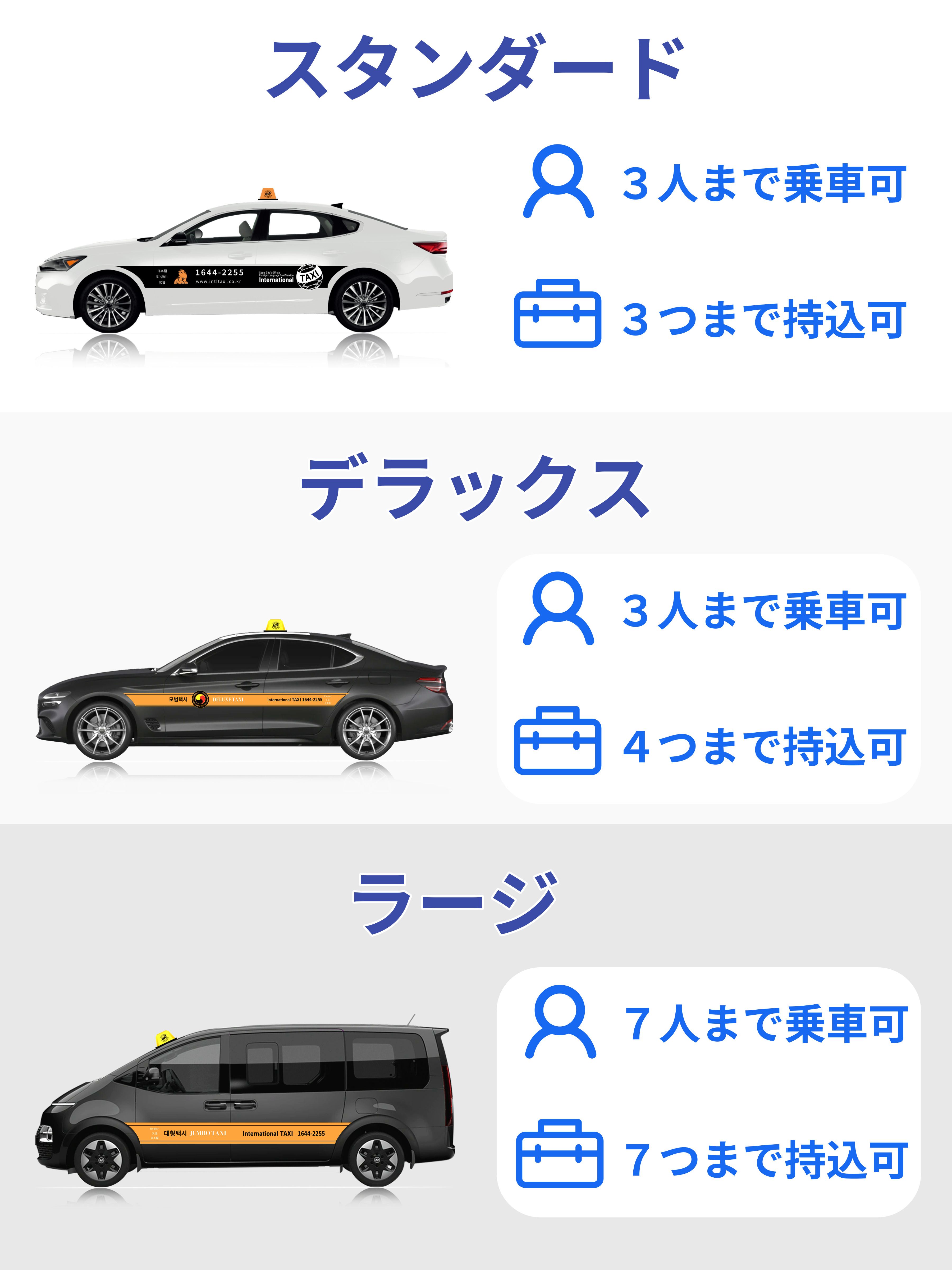 予約時は乗客数や荷物の数に合わせて、スタンダード(中型)・デラックス(模範)・ラージ(大型)の3つの車両タイプからお選びください。