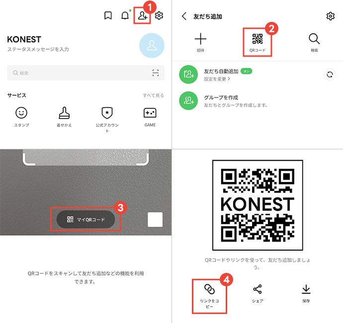 LINEホーム画面右上から「友だち追加」→「QRコード」→「マイQRコード」→「リンクをコピー」